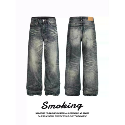 SMOKING 美式复古街头压痕水洗牛仔裤男女cleanfit宽松直筒长裤潮